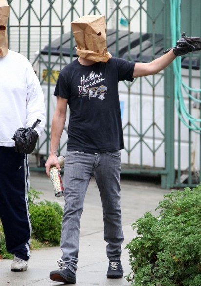 Así es. Shia LaBeouf "disfrazado" se vio encaminándose a la licorería con su amigo en Los Angeles AYER jueves. Así son los días del cuero de Tranformers, después de que su licencia de conducir fuera suspendida porque se rehusó a tomar una prueba de alcohol después de su accidente automovilístico en julio del 2008.